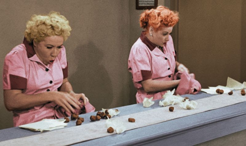 The funny part is that Lucy and Ethel’s attempts to stop motion have the opposite effect. Their supervisor speeds up the conveyor!